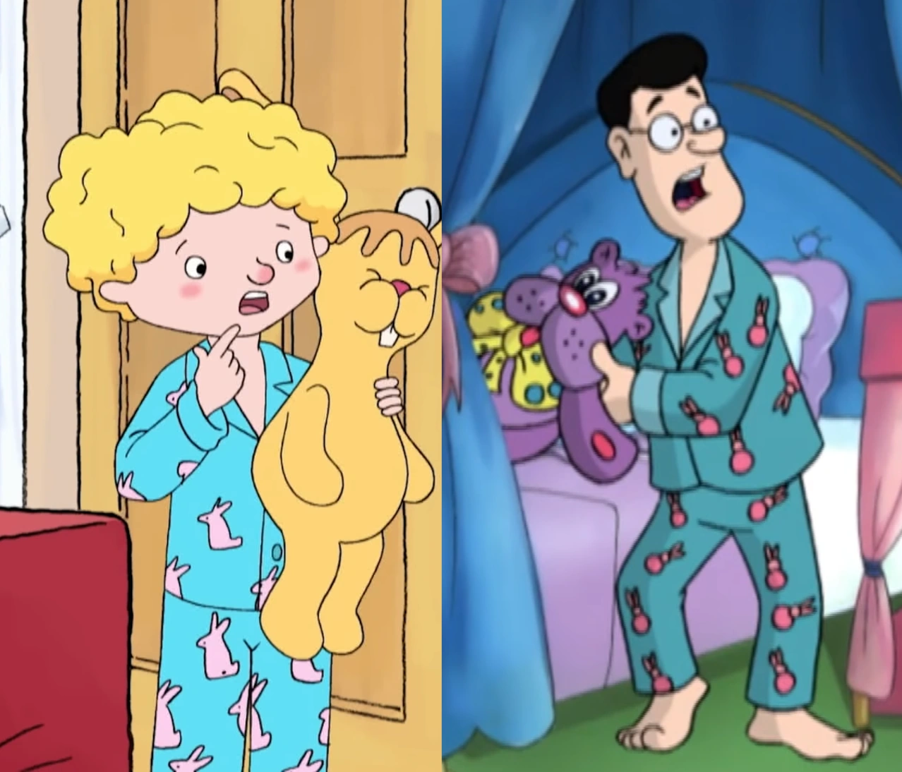 - His pyjamas resemble that of Walter the Softy's from the 1996 adaptation of Dennis the Menace and Gnasher, which are also cyan-blue with pink bunny patterns.